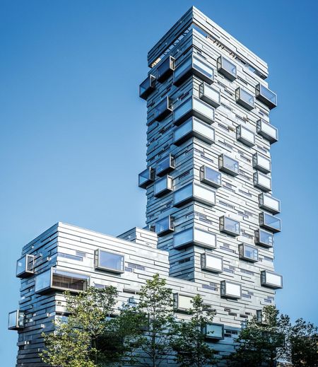 Historische Backsteinhäuser mit unregelmäßigen Fassadenoberflächen und Dachdeckungen aus Zink inspirierten Lundgaard & Tranberg Architects bei der Fassadengestaltung von Charlottehaven The Tower im Kopenhagener Stadtteil Østerbro. Aus diesem Grund ist der 54 Meter hohe Turm mit rechteckigen, unterschiedlich tiefen und langen Kassetten aus Titanzink bekleidet, die in der Tiefe und in der Länge variieren. Im Zusammenspiel mit den schmalen Fensterbändern und den teilweise über Eck angeordneten, nahezu komplett verglasten Erkern verleihen sie ihm Tiefenwirkung und eine faszinierende Lebendigkeit.