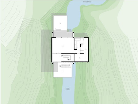 Fougeron Architecture schuf eine Verbindung zwischen dem Haus und seiner natürlichen Umgebung, indem sie transparente Materialien und durchdachte Sichtachsen verwendeten. Ein Stahlrahmen unter den Böden verankerte das Haus an den felsigen Hängen und ermöglichte das Entfernen von tragenden Säulen aus dem Bachbett. Die neu hinzugefügte dritte Etage beherbergt das Schlafzimmer und flexible Gestaltungsräume. Die obere Etage ist um 90 Grad gedreht, um den Blick auf den Wasserfall und die Umgebung zu erweitern. Die mittlere Etage beherbergt Gemeinschaftsbereiche mit Innen- und Außenräumen, während die untere Etage luftige Decks aufweist. Das Innere des Hauses bietet auch ein privates Büro, das bei Bedarf in ein Gästezimmer umgewandelt werden kann.