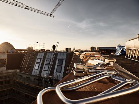 „Es ist ein Privileg, an so einem Gebäude zu arbeiten.“ Mit diesen Worten beschreibt Dachdeckermeister Schulze von der Firma Holzapfel & Schulze GbR seine Erfahrung am Projekt Victoriahöfe in Berlin-Kreuzberg. Gemeinsam mit seinem Team von 20 Fachkräften war er verantwortlich für die aufwendige Dachdeckung des denkmalgeschützten Gebäudes – insgesamt rund 3.400 m² Fläche wurden in mehreren Bauabschnitten von 2019 bis 2023 mit RHEINZINK-prePATINA blaugrau eingedeckt.