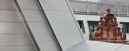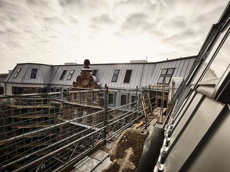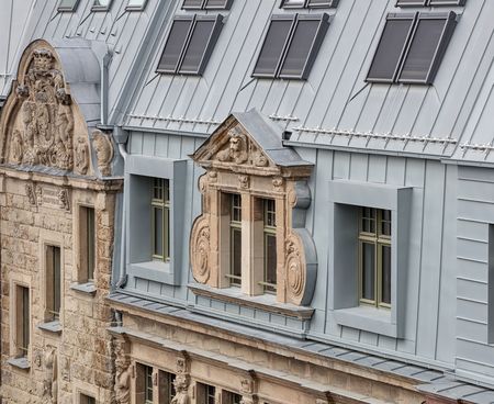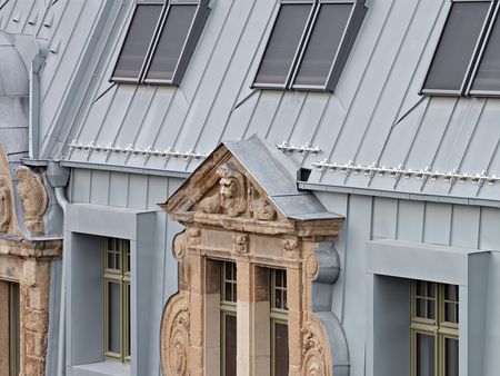 Zu einem einheitlichen Ganzen zusammengefasst wird die vielgestaltige Dachlandschaft von der Titanzink-Deckung. Das traditionelle Material und seine handwerkliche Verlegung fügen sich sowohl in die historischen Formen der Fassade als auch in die neuzeitliche Architektur der Giebel nahtlos ein. Titanzink ist damit das Bindeglied zwischen der überlieferten Fassade und der neuen Dachkonstruktion. Bei dieser Doppelfunktion lag es nahe, mit der Oberfläche RHEINZINK-prePATINA blaugrau zu arbeiten, die in einem speziellen Beizprozess bereits ab Werk eine edle Optik erhält. Sie vermeidet auf dem Dach vom ersten Tag an einen offenkundigen neuen Eindruck, nach der Verlegung beginnt unter dem Einfluss der Witterung die natürliche Patinabildung.