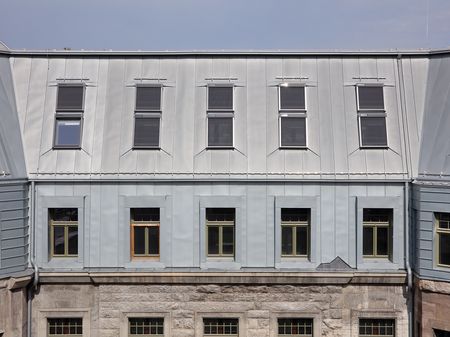 Die Victoriahöfe in Berlin-Kreuzberg zählen zu den herausragenden Revitalisierungsprojekten der Hauptstadt. Unter der Leitung von GBP Architekten wurde das ehemals größte Verwaltungsgebäude der Welt denkmalgerecht modernisiert und einer zeitgemäßen Nutzung zugeführt. Ein besonderes Augenmerk lag dabei auf dem Dachgeschoss: Der neobarocke Prachtbau von 1913 erhielt seine charakteristischen Ziergiebel zurück – interpretiert in einer Formensprache der heutigen Zeit und gedeckt mit RHEINZINK-prePATINA ECO ZINC blaugrau.