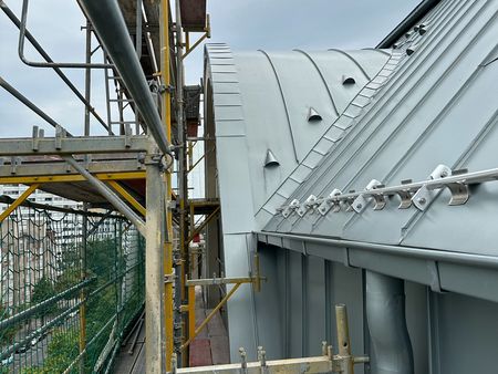 Eine Herausforderung auf dem stark gegliederten Dach war die Dacheinteilung, die praktisch für jede Teilfläche zwischen den Giebeln, Dachfenstern und Loggien neu vorgenommen werden musste. Dadurch gab es keine Standardbreite der Schare, die stattdessen mit jeweils individuellen Maßen überwiegend aus 670 mm breiten Bändern auf der Baustelle zugeschnitten und gefalzt wurden.