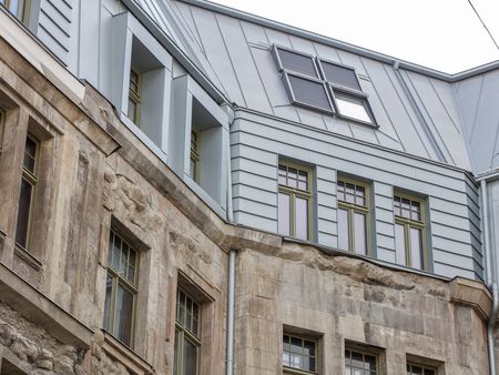 Die Entscheidung für die alle Gebäudeteile zusammenfassende Dachdeckung fiel in enger Abstimmung mit der Denkmalpflege. Aus Recherchen war zwar bekannt, dass die Straßenseiten ursprünglich mit Kupfer und die hofseitigen Dachflächen mit Ziegeln gedeckt waren. Im Sinne des homogenen Gesamteindrucks verständigten sich alle Beteiligten jetzt jedoch auf eine moderne Neuinterpretation des historischen Materialkanons mit vorbewittertem Titanzink blaugrau.