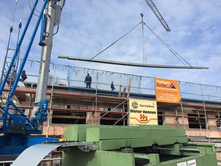 Für den Kranhub der Schare auf das Dach hatten sich die Spengler eine spezielle Traverse gebaut, sodass ein zielgenaues Absetzen auf dem Dach möglich war. Als Deckunterlage war dort eine strukturierte Trennlage ausgelegt, die der Geräuschdämpfung dient, aber vor allem ein sicheres Gleitverhalten auch bei eventuellen kleinen Unebenheiten in der Schalung sicherstellen soll.