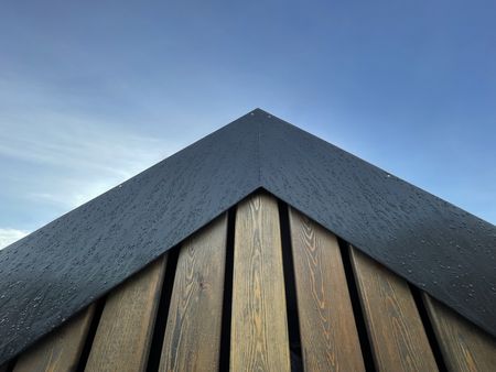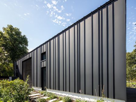 Für das Material der Fassade der Längsseiten und des Dachs war schnell klar, dass RHEINZINK die richtige Wahl war. „Eigentlich kam nur Zink in Frage“, erinnert sich Hannah Sachsse. Die anthrazitfarbene RHEINZINK GRANUM basalte-Variante erfüllte ihren Wunsch nach einer modernen, dunklen Optik und bot gleichzeitig die funktionale Langlebigkeit, die sie suchten. Besonders überzeugte das Paar, dass das Material matt ist und nicht spiegelt. „Wir wollten etwas Beständiges, etwas, was man einmal vernünftig anbringt und was dann auf ewig hält.“
