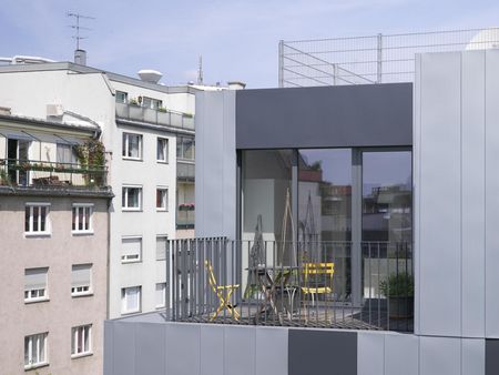 Die nachhaltige Strategie, zuerst vorhandene Bausubstanz als Basis zu nutzen, schlägt sich in intelligenten Lösungen wie Dachaufstockungen nieder, die für neuen Wohnraum sorgen. Ansehnliches Beispiel ist ein Wohn- und Geschäftshaus in Bensberg aus den 50er Jahren, das nach der Renovierung durch eine moderne Formensprache überzeugt. Die massiven Untergeschosse erhielten eine Aufstockung in Holzleichtbauweise mit einem markant geformtem Titanzinkdach. Die Aufstockung durfte wenig zusätzliche Lasten in das Gebäude eintragen, optisch wirkt sie trotz ihres Volumens nicht erdrückend.