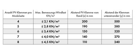 Die erforderliche Anzahl von RHEINZINK-PV Klemmen basiert auf dem Bemessungswiderstand der RHEINZINK-Haften von 600 N/Haft. Grundsätzlich sind mind. 4 PV-Klemmen an langer Modulseite (1,90m) erforderlich. Abstand der PV-Klemmen untereinander (Mitte-Mitte), ca. halber Abstand am Rand (Mitte-Rand). Angaben für Deutschland unter Berücksichtigung des Sicherheitsbeiwertes 1,5 auf Haftseite. Ggf. sind in anderen Ländern weitere Sicherheitsbeiwerte zu berücksichtigen.