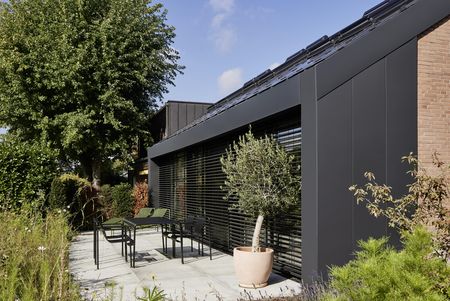 „Es gab zur Zeit der Planung kein System, wo die Solarplatten wirklich vernünftig mit den Dachziegeln funktionieren und ästhetisch integriert sind. Dadurch war schnell klar, dass es RHEINZINK wird. Außerdem wollte ich nicht so viele Materialien einsetzen, eigentlich nur zwei oder drei von außen sichtbare. So ist es mit dem Klinkerstein und dem schwarzen Holz dann das dunkle Titanzink geworden. Die Solarpaneele sind passend dazu auch dunkel. Sie können außerdem, wenn es darum geht, stärkere Leistungen erzielen zu wollen, mit neuen Paneelen ganz einfach ausgetauscht werden. All diese Aspekte haben dafürgesprochen“, so Zühlke. Das PV-System lässt sich optimal mit den entwickelten Falz- und Modulklemmen an dem RHEINZINK-Stehfalzdach befestigen. Um Einheitlichkeit und ein harmonisches Gesamtbild zu schaffen, wurde RHEINZINK GRANUM basalte ebenfalls an der Fassade verwendet.