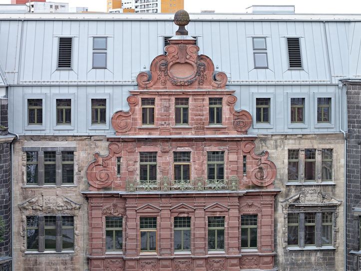 Wilhelm Walther hatte die lange Straßenfront mit insgesamt fünf Risaliten gegliedert, über denen sich jeweils opulente Ziergiebel erhoben. Bei der Reparatur nach 1945 verzichtete man auf diese Giebel und setzte stattdessen ein durchgehendes, völlig schmuckloses Dachgeschoss mit Dachpappedeckung auf. Dieses Nachkriegsgeschoss wurde im Rahmen der jetzigen Modernisierung komplett zurückgebaut und durch eine zweigeschossige Stahlbetonkonstruktion ersetzt. Das erweiterte nicht nur die nutzbare Fläche im Gebäude, sondern erlaubte auch eine völlige Neugestaltung der Dachlandschaft.