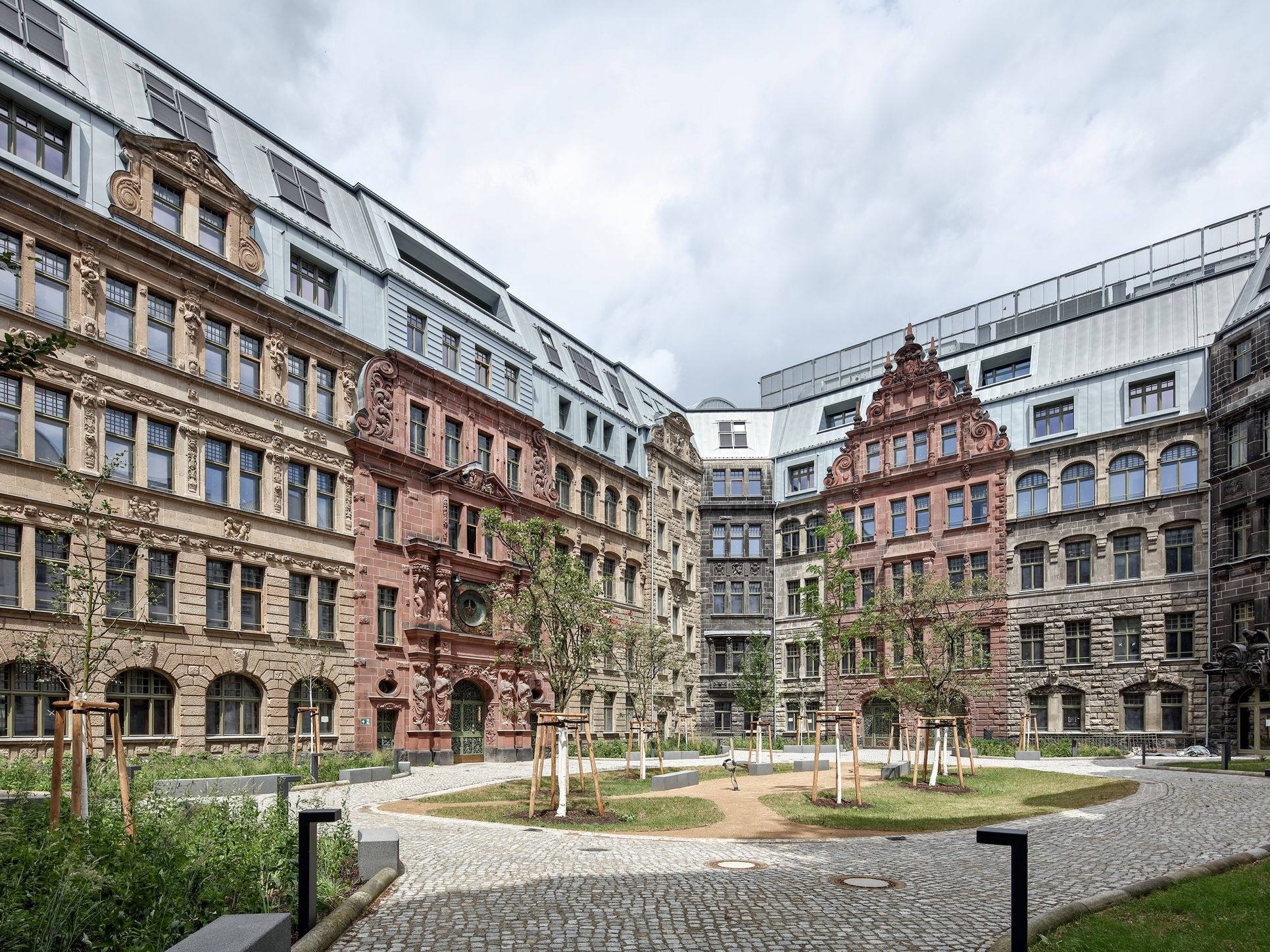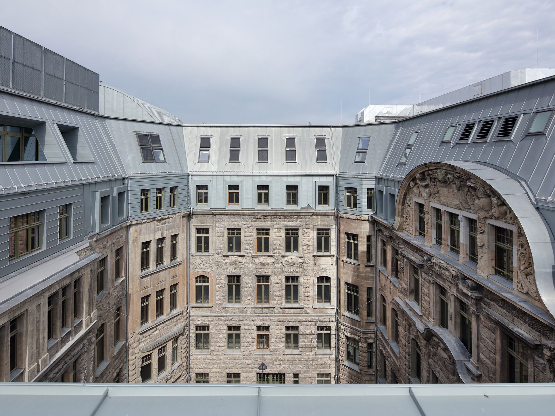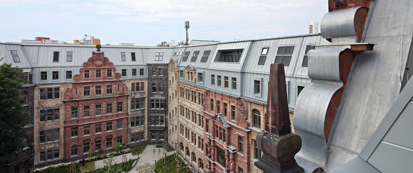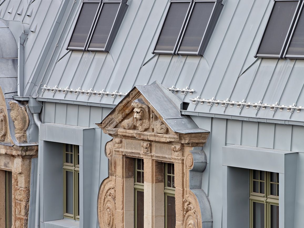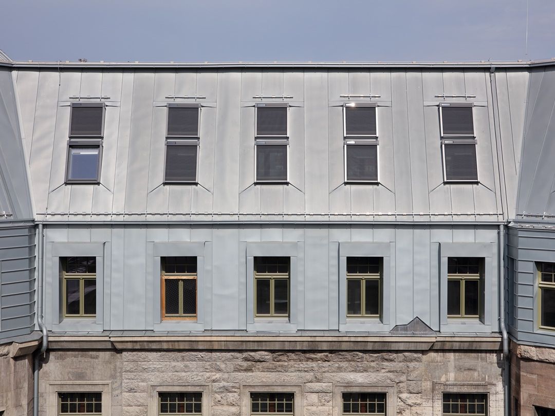 Die Entscheidung für die alle Gebäudeteile zusammenfassende Dachdeckung fiel in enger Abstimmung mit der Denkmalpflege. Aus Recherchen war zwar bekannt, dass die Straßenseiten ursprünglich mit Kupfer und die hofseitigen Dachflächen mit Ziegeln gedeckt waren. Im Sinne des homogenen Gesamteindrucks verständigten sich alle Beteiligten jetzt jedoch auf eine moderne Neuinterpretation des historischen Materialkanons mit vorbewittertem Titanzink blaugrau.
