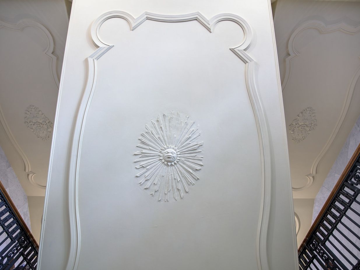 Die Fallrohre der Dachentwässerung verlaufen analog zum historischen Vorbild vor der Fassade. Die Regenrinnen fügen sich durch die konsequente Ausbildung als Gesimsrinne sehr dezent in die Architektur ein und sind praktisch nicht als eigene Bauteile erkennbar. Was ähnlich auch für die Belüftung des Dachs gilt: Sowohl am Fuß des Mansarddachs als auch im Knickbereich zu den Hauptdachflächen sowie an deren oberen Ende befinden sich jeweils Lochbleche für die Be- und Entlüftung, die aus der normalen Betrachtungsposition von unten nicht zu erkennen sind.
