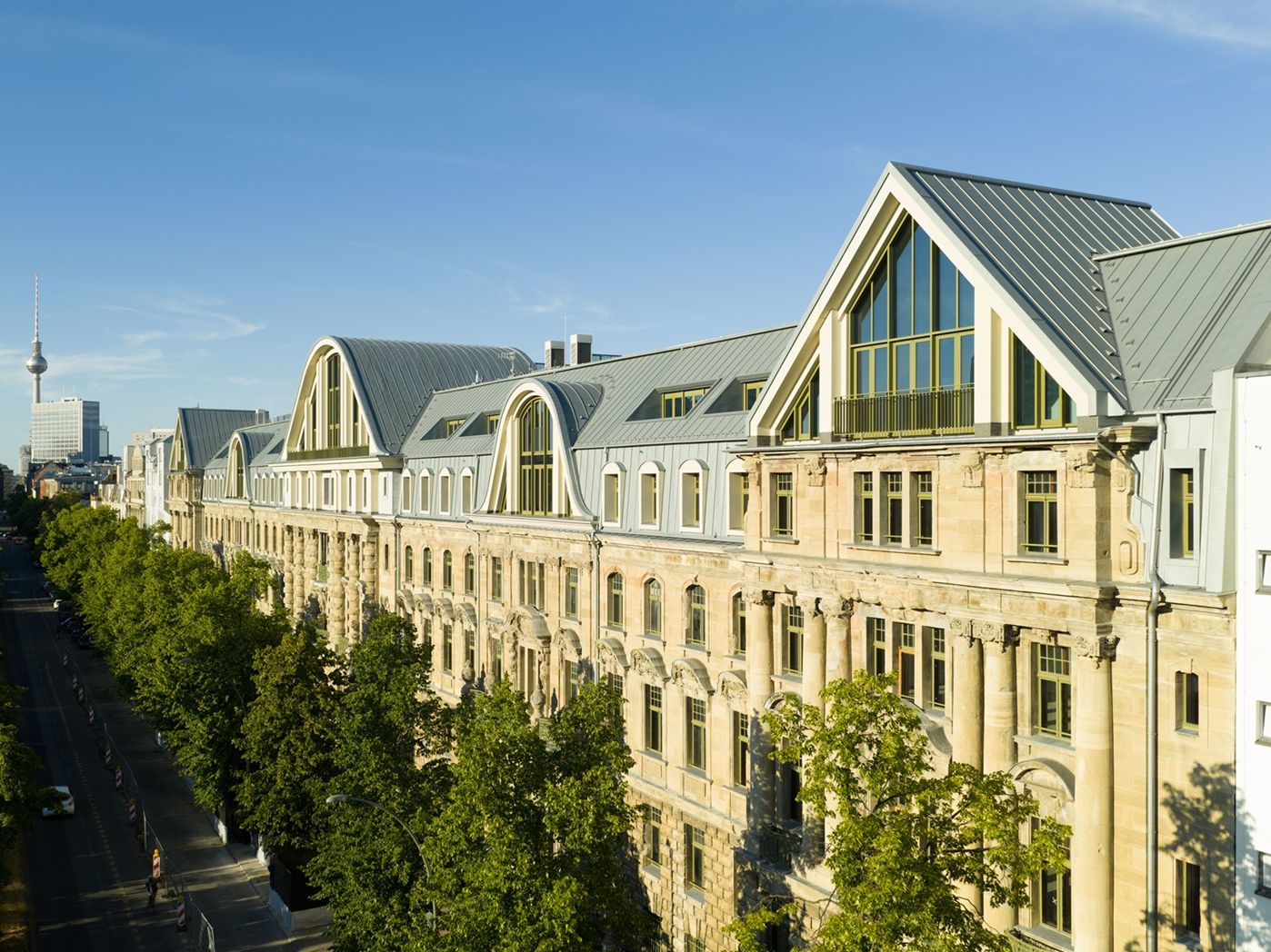Den Höhepunkt der Dachgestaltung bilden die neu interpretierten Giebel über den historischen Risaliten, die an den beiden Außenseiten als Dachspitzen und an den drei dazwischenliegenden Giebeln als markant gewölbte, kuppelähnliche Konstruktion ausgeführt sind. Unter diesen Rundungen entstanden beeindruckende Veranstaltungssäle mit bis zu 8 m hohen Glasfassaden und einem atemberaubenden Ausblick über die Dächer Berlins.