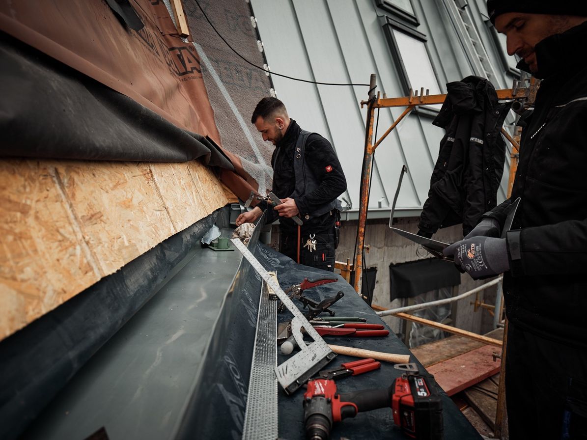 Holzapfel & Schulze begannen die Arbeiten auf der neu errichteten Tragkonstruktion des Daches aus Stahlbeton mit darauf liegender Dampfsperre und 180 mm Aufdachdämmung. Die Dämmebene ist mit einer Unterdeckbahn abgedeckt. Im Anschluss folgt die Konterlattungsebene, die den Belüftungsraum herstellt, sowie die Tragschalung. Als Witterungsschutz der Konstruktion während der Bauphase, wurde darauf im ersten Schritt eine flächige Trennlage verlegt. Im Zuge des weiteren Baufortschritts wurde die Strukturmatte RHEINZINK-AIR-Z verlegt, sodass die Funktionalität einer strukturierten Trennlage gegeben ist. Die Trennlagenkombination sorgt für eine sichere Ableitung von möglichem Kondensat und bietet des Weiteren eine verbesserte Gleitfähigkeit der Schare bei thermischer Längenänderung.