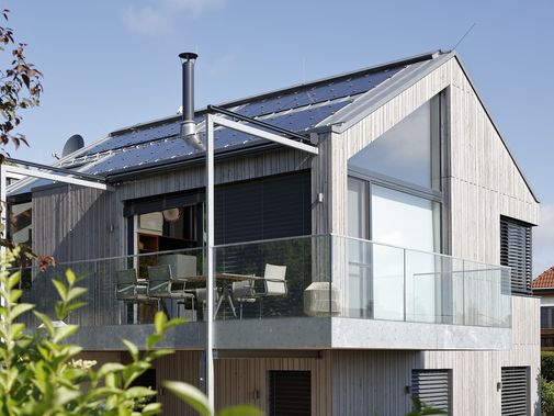 Bei dem Neubau in Wien wurde das klassische Haus mit Satteldach in zeitgemäßer Formensprache interpretiert. Die Lärchenholzfassade und das Titanzinkdach lassen eine scharfkantige, präzise Kubatur entstehen, in die sich auch die besonders flache, die klare Geometrie nicht beeinträchtigende PV-Anlage einfügt.