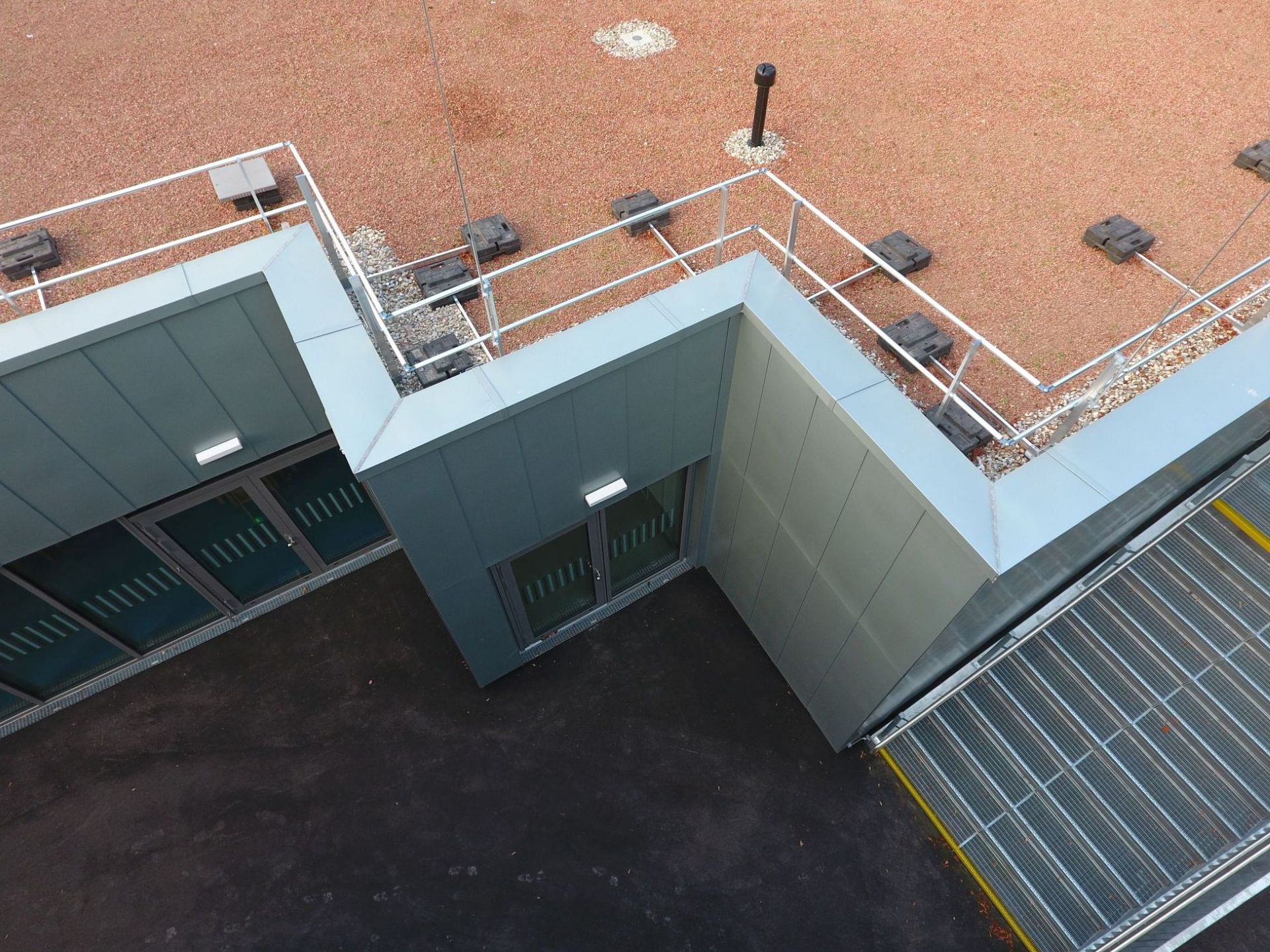 Betrachtet man die Fassade von oben nach unten, wird mit einer Winkelstehfalzfassade in vertikaler Ausrichtung gestartet, wobei verschnittoptimiert unterschiedliche Scharbreiten zum Einsatz kamen. Überall dort, wo ein Fensterband die Winkelstehfalzfassade unterbricht, war Vorgabe der Architektur einen Systemwechsel von Winkelstehfalz auf Großraute vorzusehen. Damit hat man unmittelbar unterhalb der Fenster ein glattes Erscheinungsbild, das sich vertikal betrachtet bis zur Geländeoberkante durchzieht.