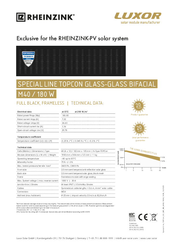 Exclusive for the RHEINZINK-PV solar system SPECIAL LINE TOPCON GLASS-GLASS BIFACIAL. M40 / 180 W FULL BLACK, FRAMELESS | TECHNICAL DATA: 20 YE AR at STC Rated power Pmpp [Wp] 180.00