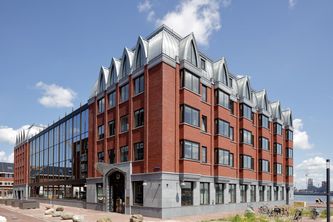 Schon von weitem erinnert BOAT&CO mit seinen rot-orangefarbenen Ziegeln an die Architektur der Amsterdamer Schule. Um sich von den angrenzenden Gebäuden zu unterscheiden, wollte Kollhoff & Pols dem Hotel einen festlichen Charakter geben.