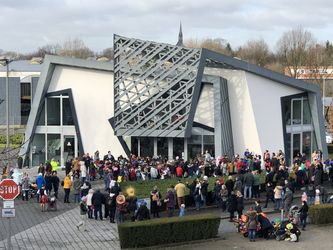 Während ihres farbenfrohen Karnevalsumzugs durch den Stadtteil statteten rund 200 „Meckischüler“ der Firma RHEINZINK an der oberen Bahnhofsstraße unter Helau und Alaaf einen närrischen Besuch ab.