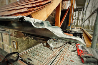 Christian Bickel war beauftragt, einen Wandanschluss herzustellen und diesen mit Bleiwolle zu verstemmen. Aufgrund der Bruchsteinmauer war jedes Blech und jede Biberschwanzziegel ein Unikat.