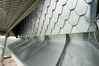 Bei der Hörnschemeyer Dächer GmbH & Co. KG ist etwas ganz Großes entstanden: Im Rahmen eines Azubi-Projektes wurde eine Wand des Aufenthaltsraums mit RHEINZINK prePATINA ECOZINC in schiefergrau bekleidet.