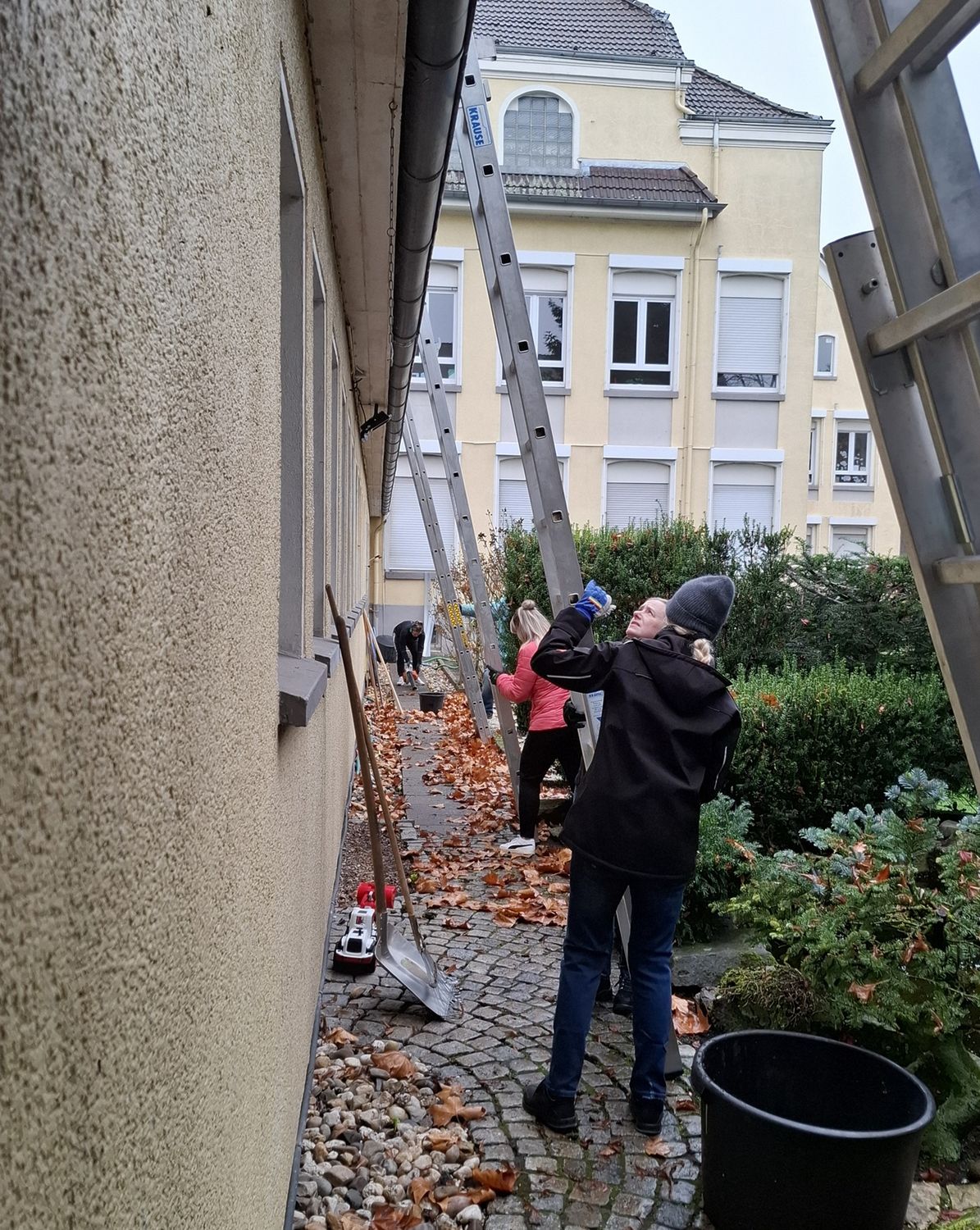 In der Zeit von 9 bis 12 Uhr übernahmen die freiwilligen Helferinnen und Helfer verschiedene Arbeiten auf dem Schulgelände: Das Dach des Toilettenhauses wurde von Moos und Verschmutzungen befreit, Dachrinnen gereinigt und ein alter Laubschutz aus Kunststoff entfernt. Im Anschluss installierte das Team einen neuen Laubschutz aus RHEINZINK. Darüber hinaus wurden Bereiche des Schulhofs gründlich gesäubert.